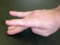 [Σ ‘αυτό το σημείο μου έδειξαν ένα χέρι, αντίχειρας διπλωμένος ακριβώς κάτω από τον μεσαίο και τον παράμεσο και τα δύο εξωτερικά δάχτυλα προς τα έξω σαν ένας μικρός άγγελος με απλωμένα φτερά. Σήκωσα και τα δύο μου χέρια να σχηματίσω αυτό που μου έδειχναν.]